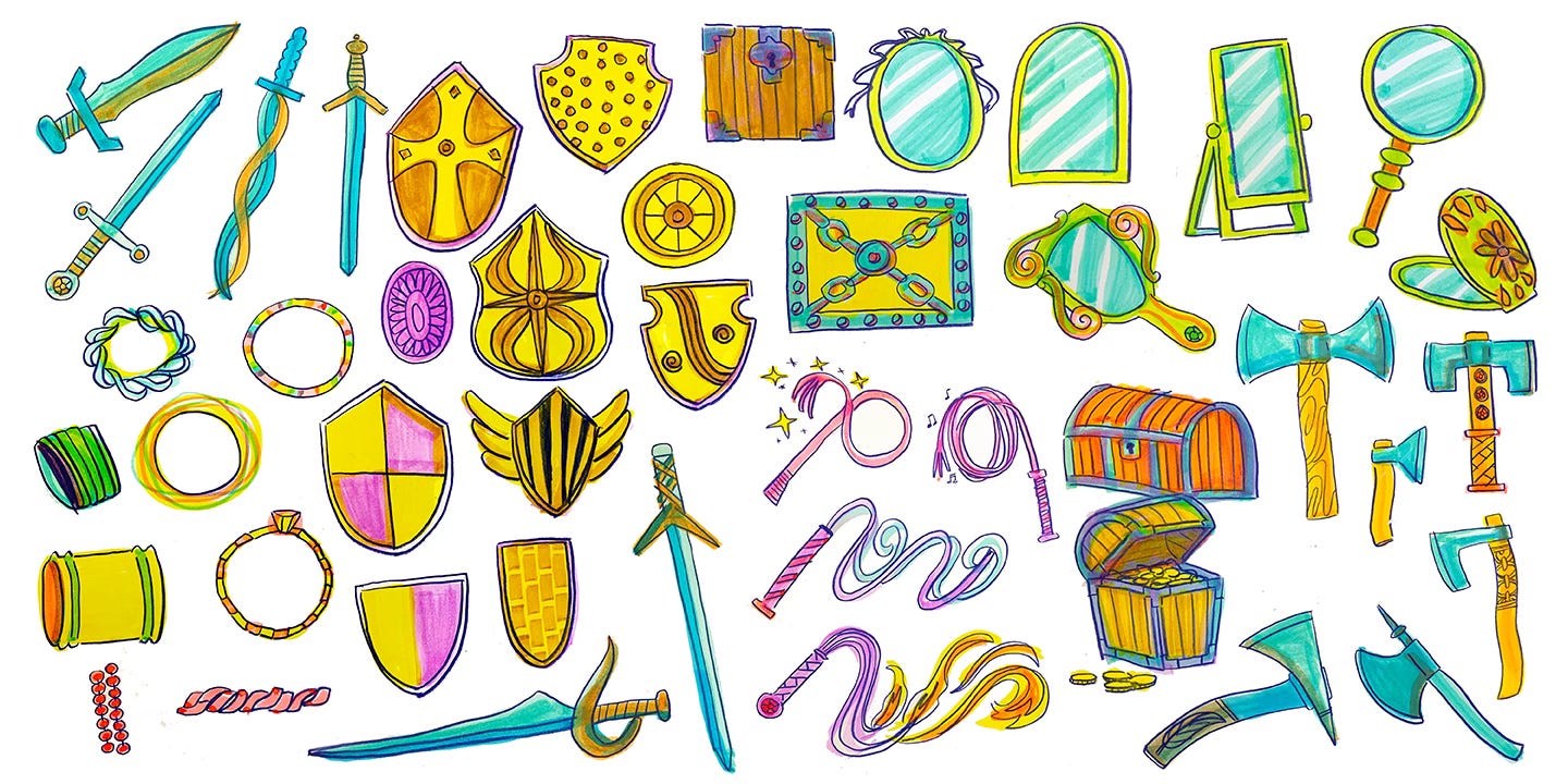 JEN: Over the last few years, I’ve discovered that I’m pretty good with quick, timed drawings. I find a lot of joy in the timed drawing practice from Art Gym and Beth Spencer’s Introvert Drawing Club I think the key is doing them so fast that you don’t have time to care about the result. And then, before you know it, you have a whole bunch of drawings. Not all of them will be good, but this is about play and discovery. I like to think of this as drawing like a fighter class in D&D. The sketchbook pages are dungeon rooms and each drawing you fill the page with is more XP so you can level up your quick drawing skills. Here’s what I got done today in two sessions of 45 minutes each:
